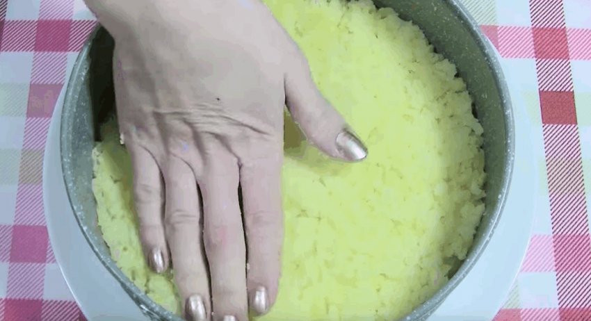 Потім узяти форму і викласти в ній 1-й шар із подрібненої картоплі.![]()