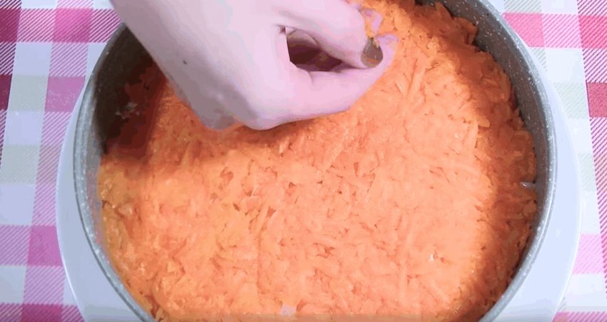 Черговий шар робиться з подрібненої цибулі, який також покривається майонезом. Терта морква утворює 4-й шар, який теж покривається майонезом.![]()