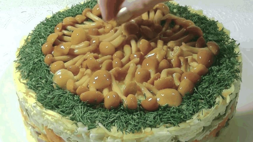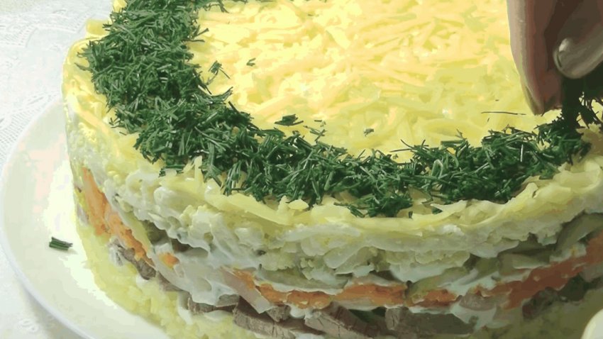 По краях сирного верху салату робиться по колу доріжка завширшки 2 см із подрібненої зеленої зелені кропу.![]()