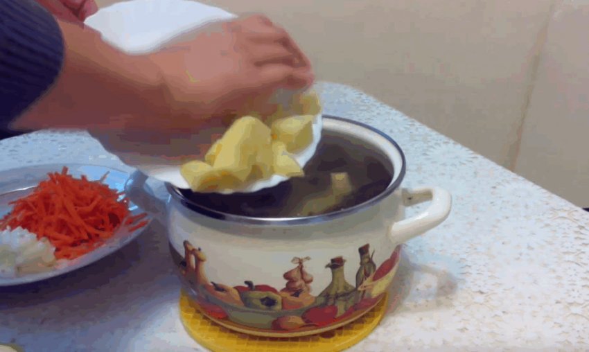 Потім із додаванням вершкового масла обсмажити їх на сковороді. Готову зажарку додати в каструлю з супом і довести картоплю до повної готовності.![]()