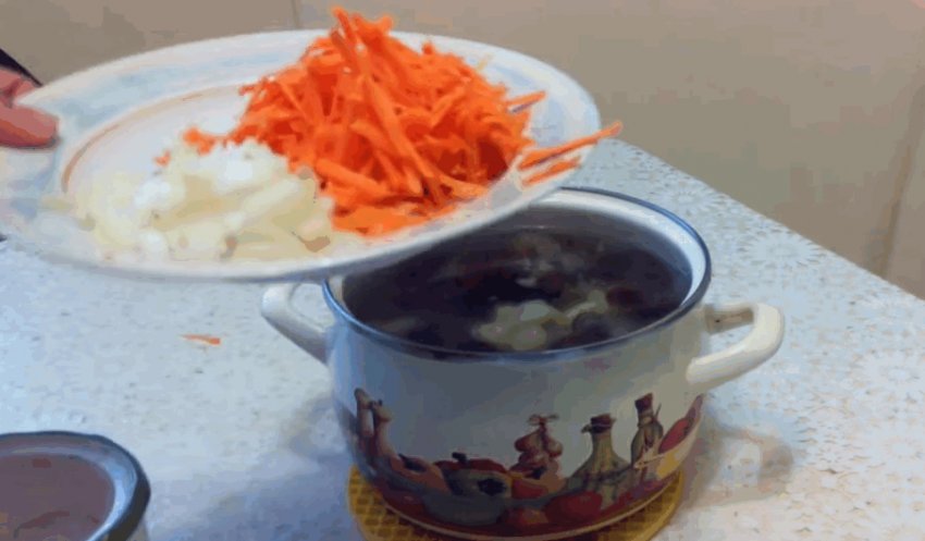 Поставити каструлю знову на вогонь середньої інтенсивності і варити вміст до досягнення картоплею напівготовності. Поки вариться суп, нарізати соломкою моркву і подрібнити цибулю.![]()