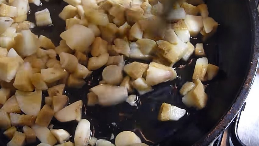 остудити, промити під струменем води, порізати шматочками. Підсмажити їх протягом 20 хвилин на сковороді з олією, періодично помішуючи.![]()
