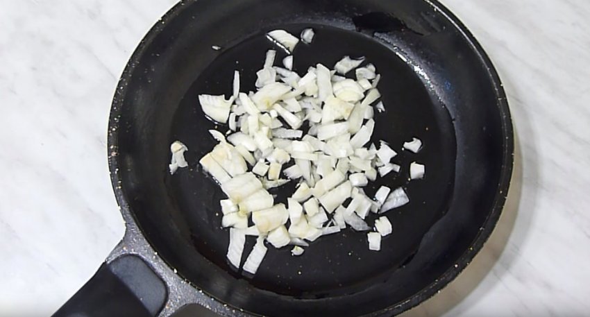 кубиками цибулю, помістити її на сковорідку з рослинною олією. Томити під закритою кришкою до прозорості.![]()