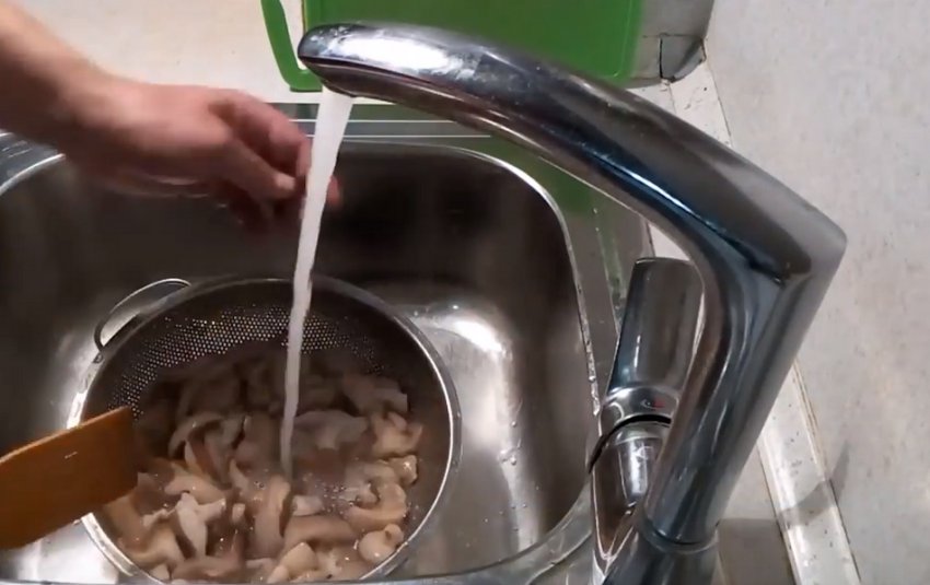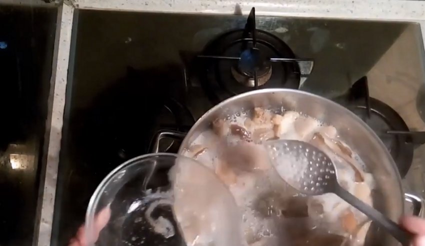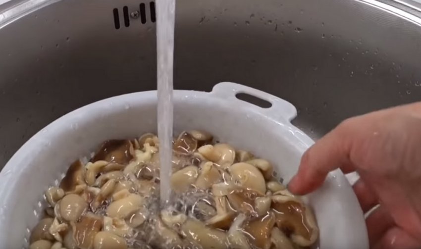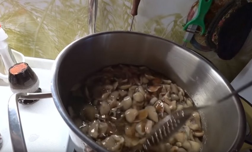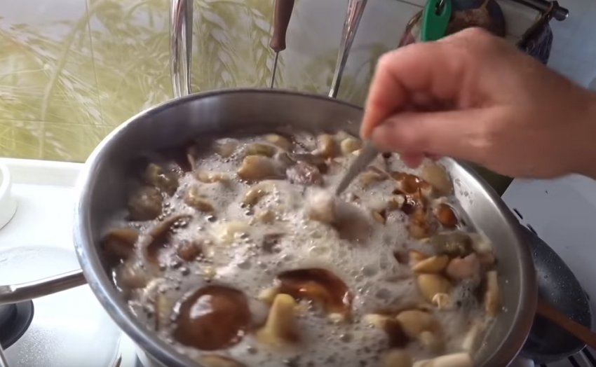 на плиті на малому вогні 30-40 хвилин, помішуючи 3-4 рази. Злити відвар і добре промити гриби під проточною водою.![]()
