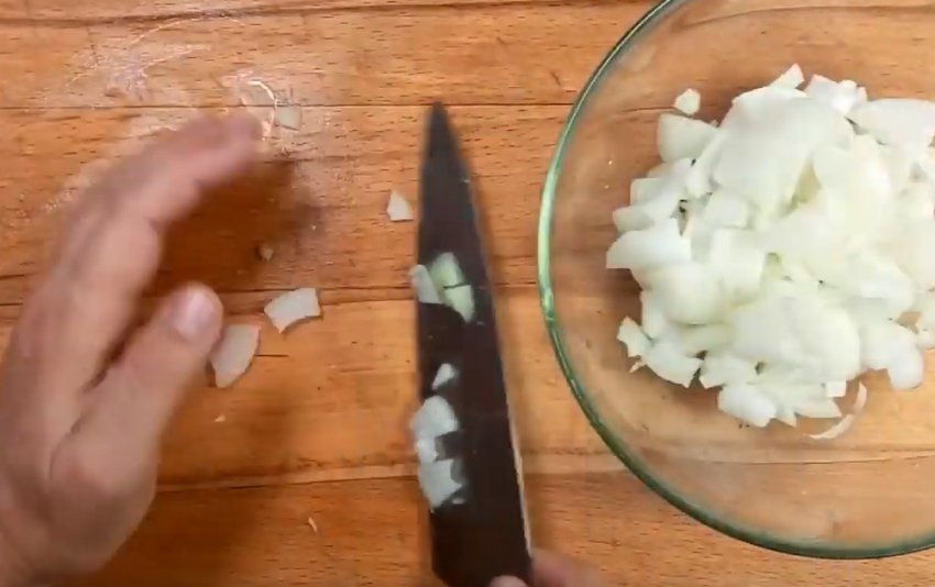 нарізати кубиками, дрібно порізати цибулю.![]()