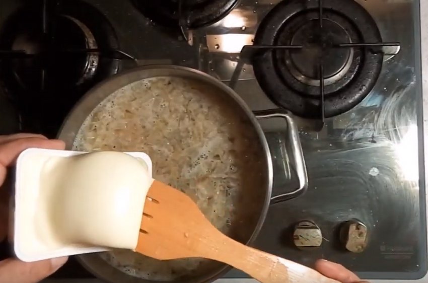 цибулю. Ввести гриби, сметану, кріп. Закип'ятити, постійно помішуючи.![]()