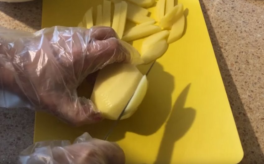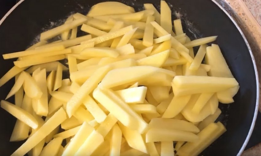 на друшляк. Почекати, поки стече рідина. Картоплю нарізати брусочками, залишити для просихання.![]()