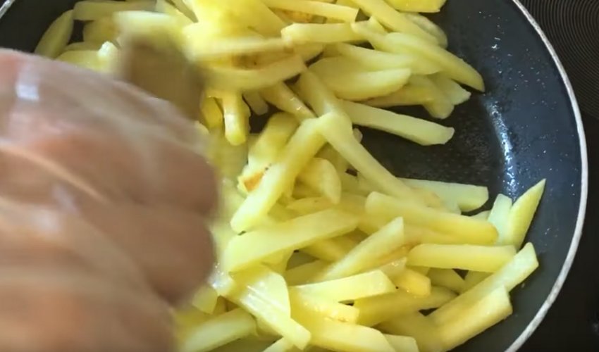 утворення золотистої скоринки знизу посолити, помішати. При періодичному помішуванні підсмажити картоплю до напівготовності.![]()