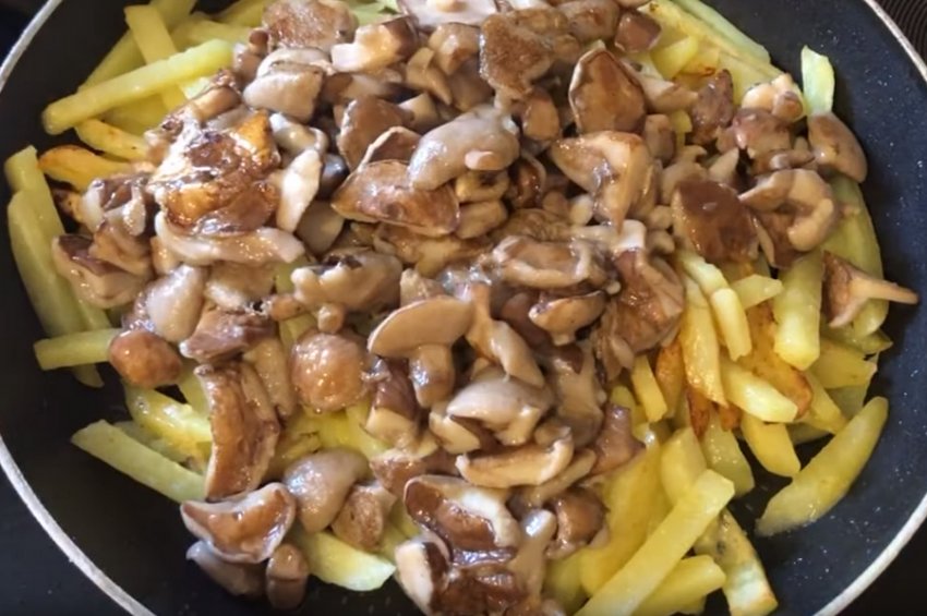 обсмажити в іншій сковороді. У середині смаження посолити. Змішати картоплю з грибами. Періодично перемішуючи, довести до готовності.![]()