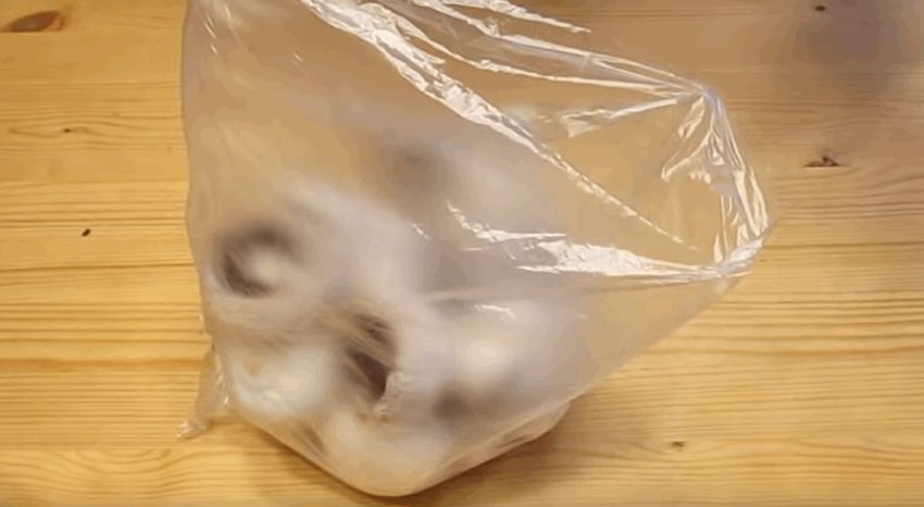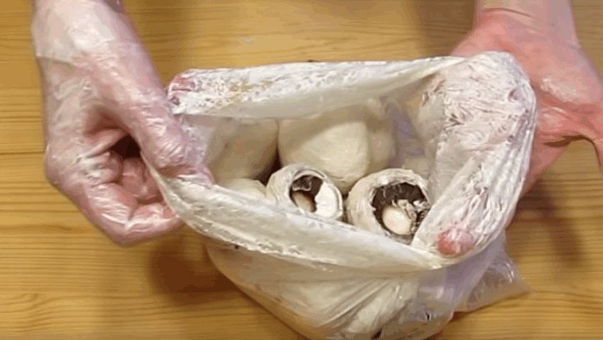 Очищені та промиті капелюшки краще замаринувати. Для цього їх треба помістити в целофановий пакет, додати кілька столових ложок майонезу й акуратно розмішати, щоб соус рівномірно розподілився.![]()