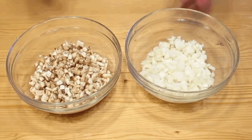 Грибні ніжки нарізати невеликими шматочками. Головку цибулі також дрібно подрібнити.![]()