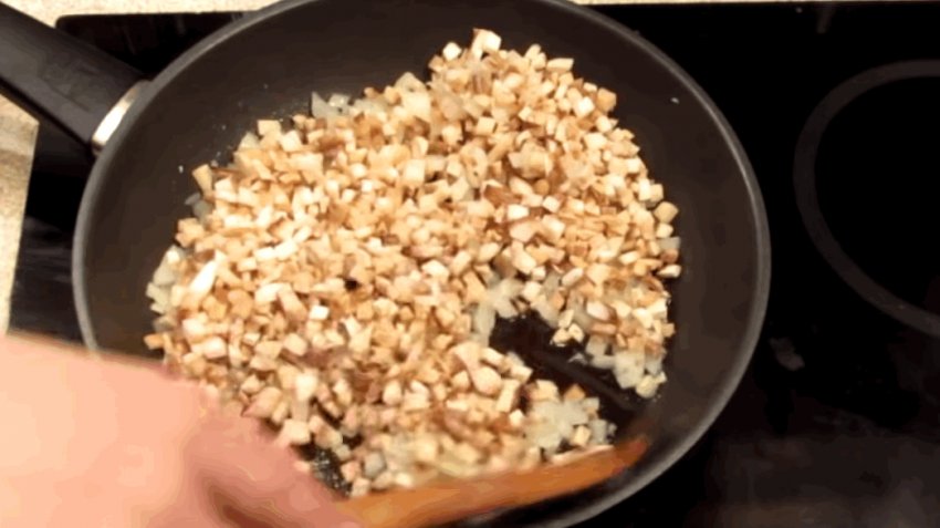 На розігріту з соняшниковою олією сковорідку викласти цибулю. Коли вона підсмажиться, кинути подрібнені грибні ніжки. Гриби пустять вологу. Потрібно почекати, коли волога випарується і печериці повністю підсмажаться. Потім дати охолонути.![]()