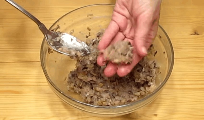 Усе перемішати. Для густоти краще додати дві столові ложки панірувальних сухарів. Їх можна не використовувати, але саме таким чином можна позбутися зайвої вологи, яку виділятимуть гриби під час запікання.![]()