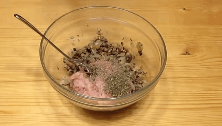 Після, в отриману грибну масу, додати курячий фарш, а також сіль, подрібнений часник, перець і спеції за смаком.![]()