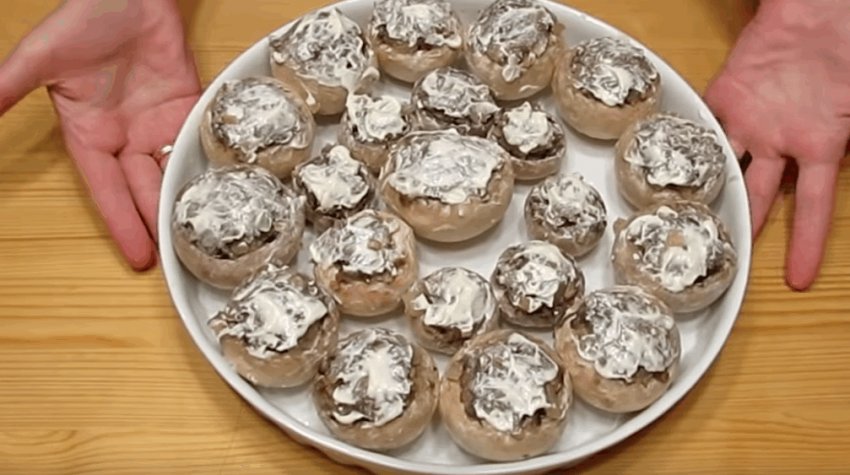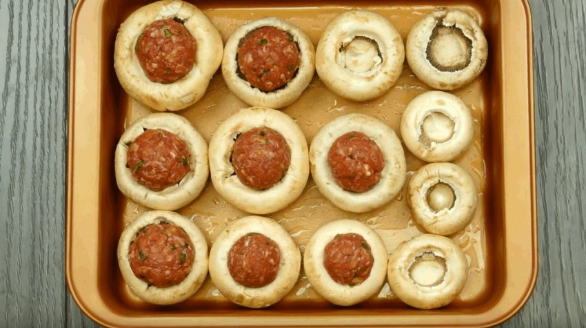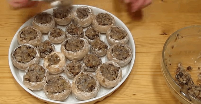 Отриману масу щільно, з невеликою гіркою розкласти по капелюшках. Потім мокрими руками акуратно вирівняти начинку.![]()