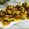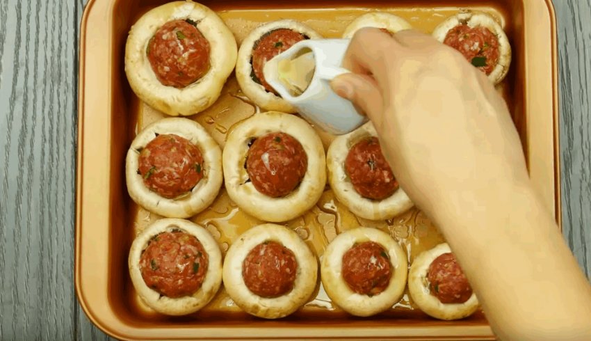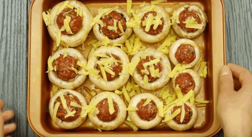Скачати з отриманої маси тюфтельки однакового розміру і розкласти їх у капелюшки печериць.![]()