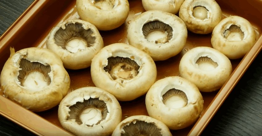 Підготовлені капелюшки грибів розкласти на змащене олією деко або відповідну форму для запікання.![]()