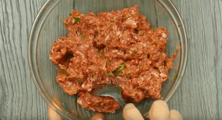 У яловичий фарш кинути сіль, спеції, порубану зелень і розмішати до отримання однорідної маси.![]()