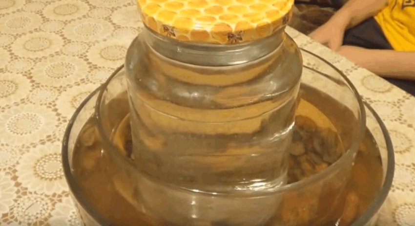 Підготувати миску, діаметр якої трохи менший, ніж ширина ємності з грибами. Встановити миску на верхній шар, зверху поставити вантаж (наприклад, літрову баночку зі скла, наповнену водою).![]()