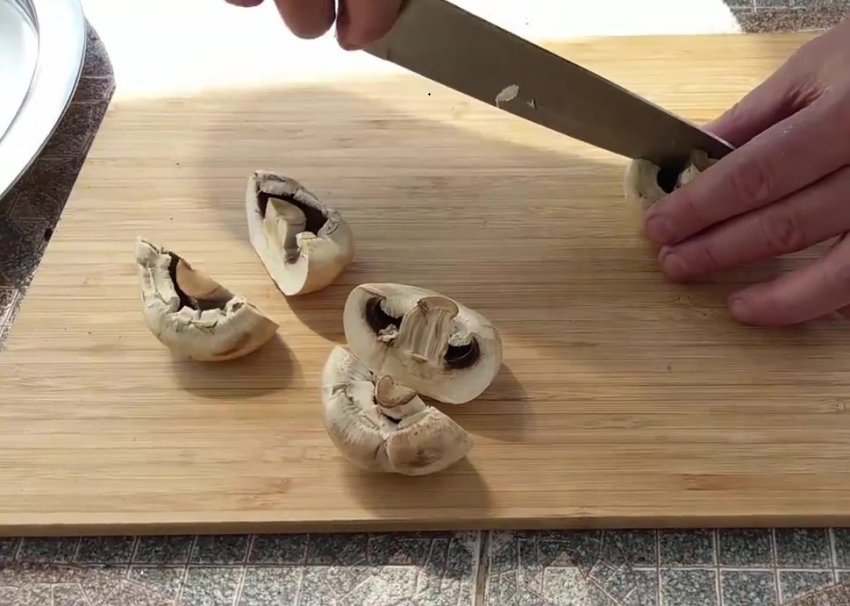 Порізати гриби навпіл, четвертинки або середні смужки залежно від їхнього розміру. Можна залишити і цілими.![]()