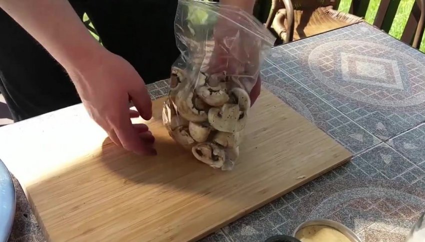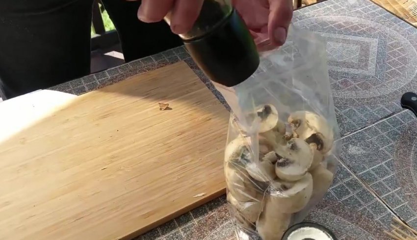 Залити оливкову олію, застебнути пакет і ретельно перемішати, дати грибам замаринуватися близько 10 хвилин.![]()