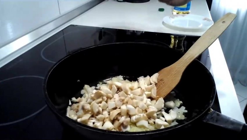 Посмажити на пательні з рослинною олією та половиною столової ложки соєвого соусу цибулю та нарізані ніжки печериць до золотистості.![]()