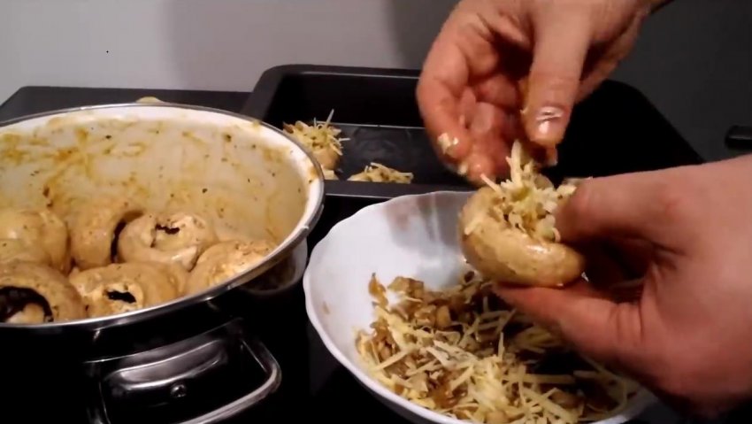 Начинити капелюшки, викласти їх на змащене олією деко. Маринадом, що залишився, полити зверху.![]()