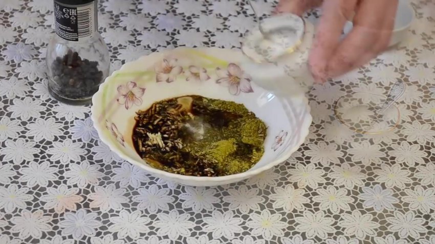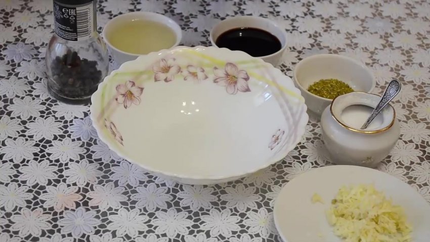 Для підготовки маринаду, в глибокій тарілці змішати всі приправи, сіль, перець, олію і винний оцет. Замість останнього можна використовувати соєвий соус. Ретельно перемішати до однорідності.![]()