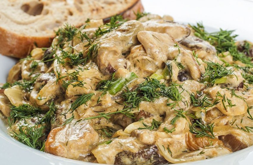 Додати приправи, сіль і сметану. Смажити 5 хвилин.![]()
