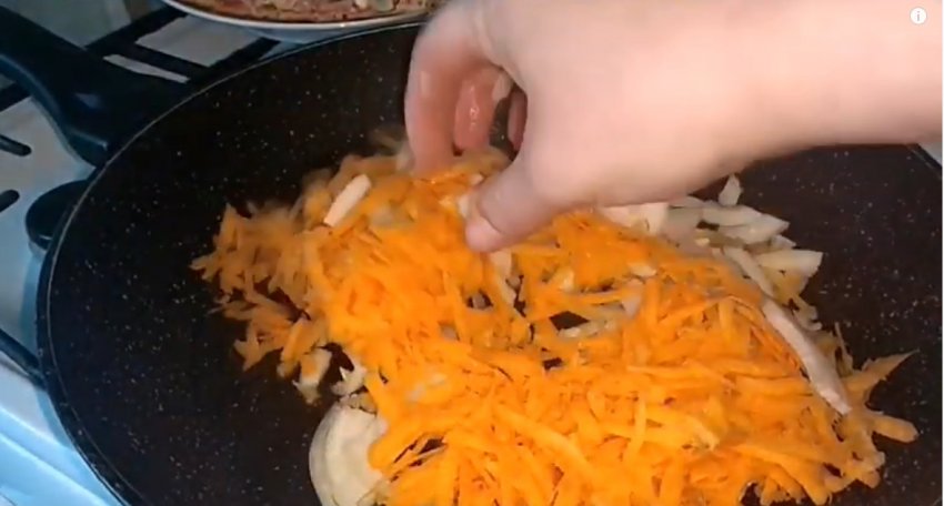 Влити в сковороду олію. Помістити в неї цибулю з морквою. Підсмажити 2 хвилини.![]()