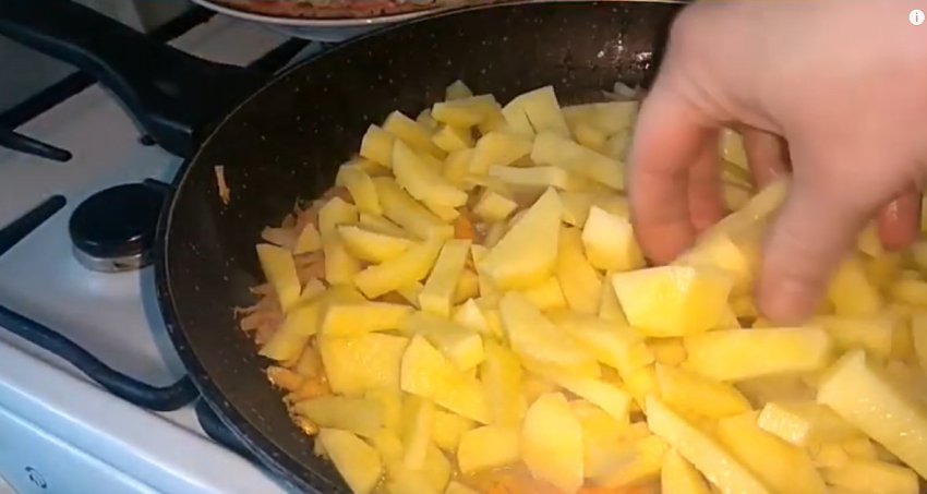 Покласти в сковороду картоплю. Обсмажити 15 хвилин на середньому вогні, постійно помішуючи.![]()