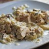 - М'ясо птиці помістіть на деко і посипте дрібно нарізаними грибами.