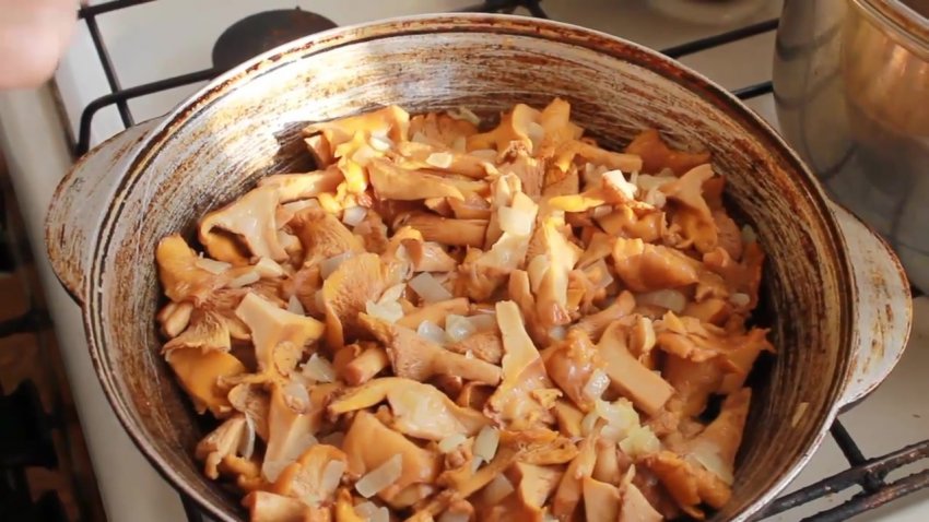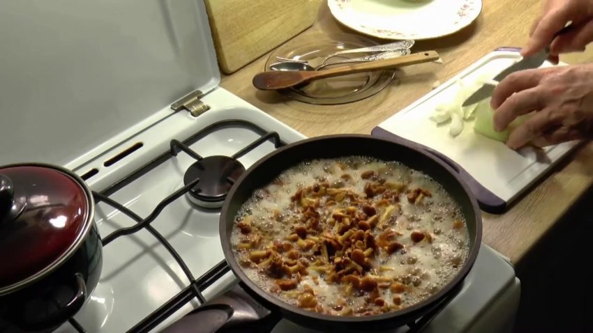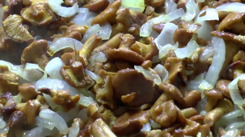 - Лисички закласти до цибулі, смажити протягом 20 хвилин, поки не випарується волога