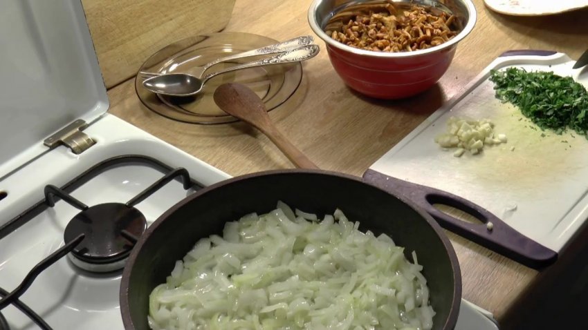 - посмажити гриби на олії 15 хвилин. Закласти подрібнену цибулю, смажити ще 5-7 хвилин