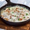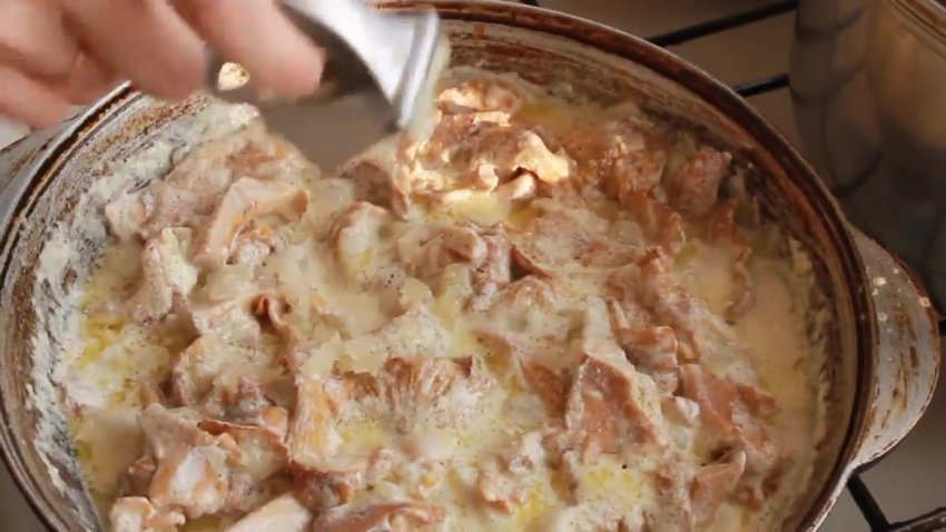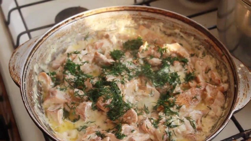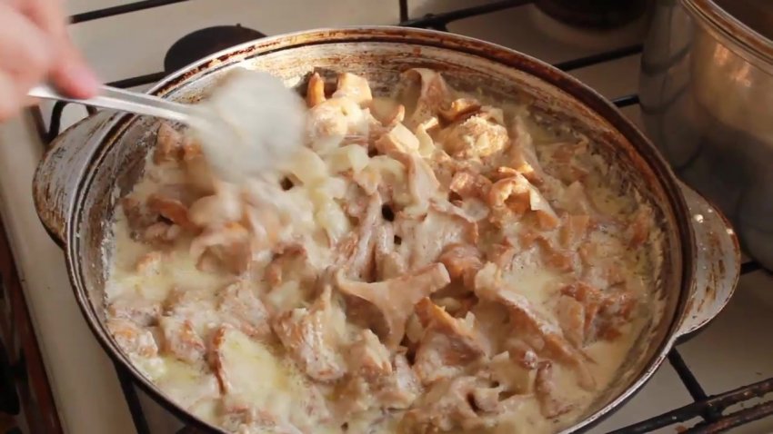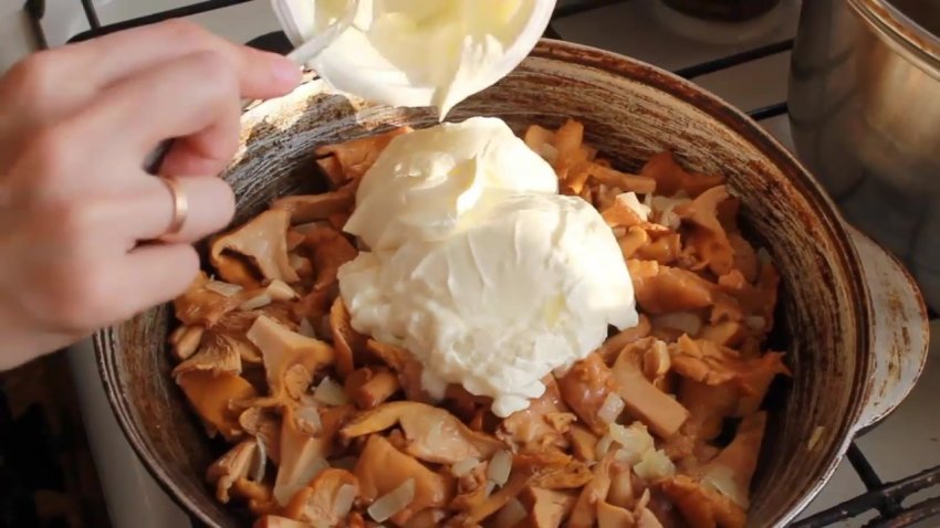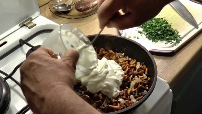 Смажити гриби протягом 5 хвилин, залити сметаною і 0,5 склянкою окропу. Змішати інгредієнти.![]()