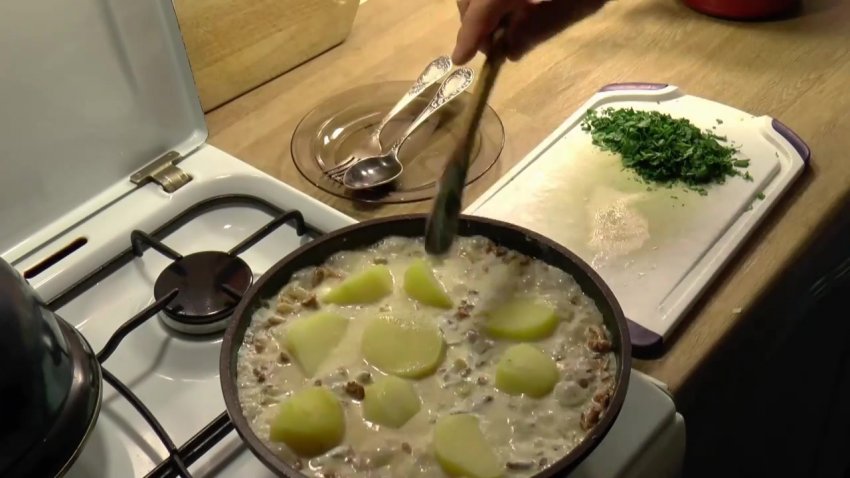Напівготову картоплю нарізати товстими слайсами, закласти в сметанно-грибну масу.![]()