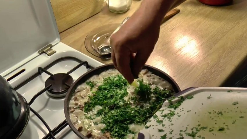 - Цибулево-грибну масу приправити спеціями, довести до готовності