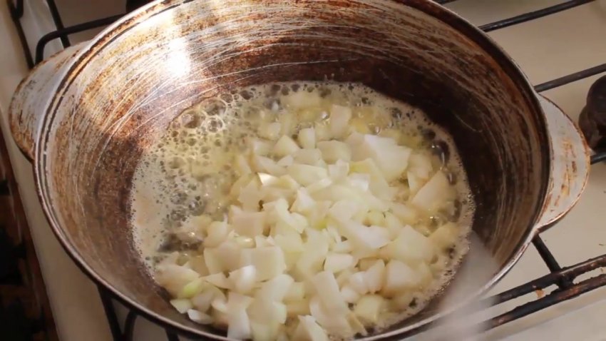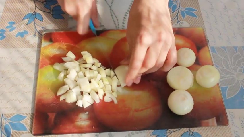 - Цибулину нарізати у вигляді кубиків, обсмажити до прозорого стану на олії.