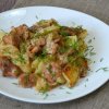 - М'ясо подрібнити дрібними шматочками, обсмажити на великому вогні протягом 5 хвилин, потім вогонь зменшити і смажити ще 10 хвилин.