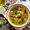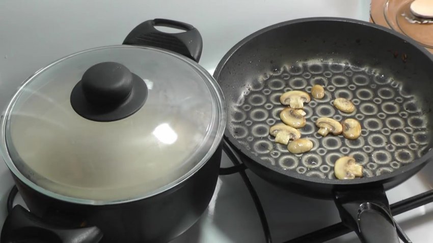 На повільному вогні довести суп до кипіння. У цей же час на сковороді з оливковою олією обсмажити шматочки грибів, що залишилися.![]()