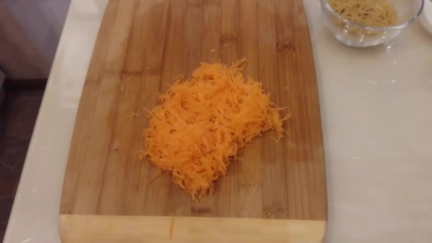 Натерти моркву на дрібній тертці, відправити до цибулі.![]()