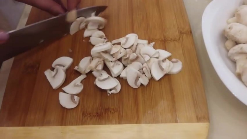 - Очистити ніжки грибів, відокремити їх від капелюшків. Гриби нарізати невеликими кубиками.