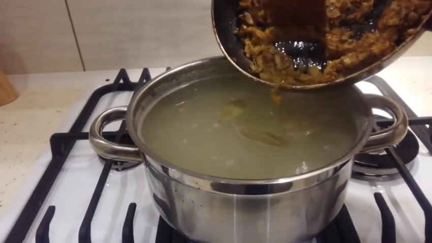 - У каструлю з супом відправити цибулево-грибну суміш, сіль, перець і лавровий лист.