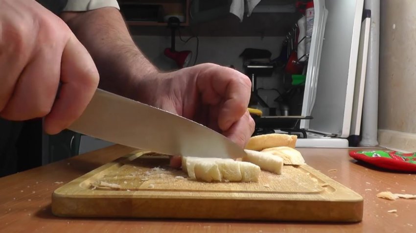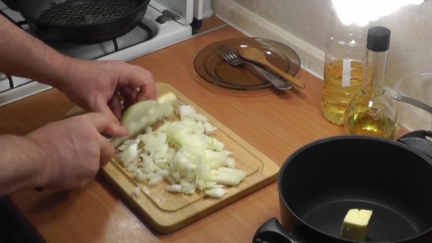 - Поставити на вогонь воду і зайнятися нарізанням цибулі та картоплі невеликими кубиками.