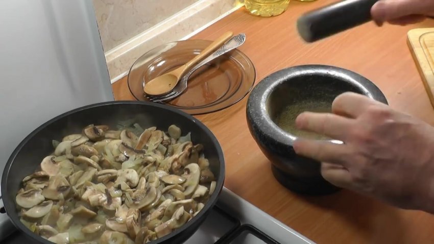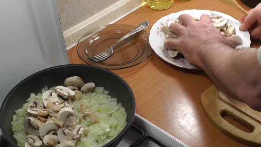 - До грибної суміші додати нарізану кубиками цибулю. Поперчити та посолити. Довести ароматну суміш до готовності.