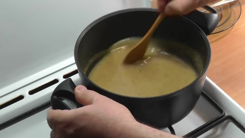- Влити в каструлю молоко і додати картоплю. Регулярно помішувати.