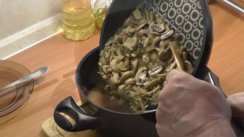 Всипати в каструлю гриби, прожарити до появи рідини.![]()