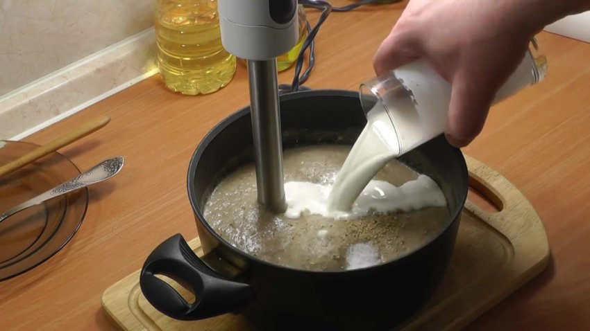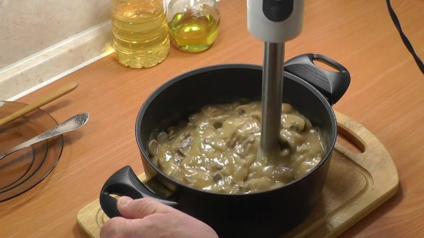 Подрібнити печериці, додати до цибулі. Перемішати. Якщо є бажання, можна залишити трохи грибів для прикраси готового крем-супу.![]()