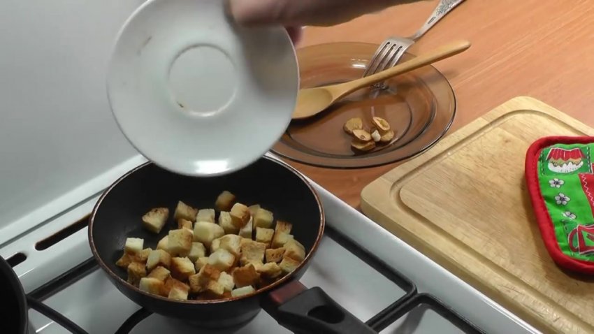 Приготувати грінки із сухого білого хліба. Його нарізають маленькими скибочками і відправляють у духовку, розігріту до 180 градусів, на 5-10 хвилин.![]()