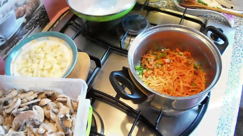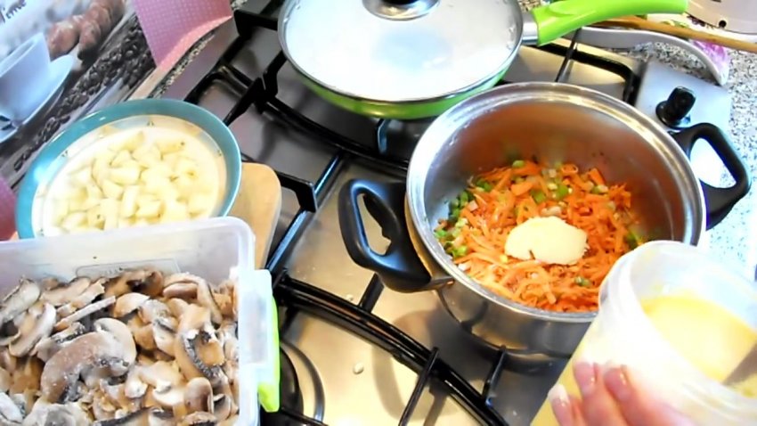 - Натерти моркву, порізати печериці, цибулю і картоплю.